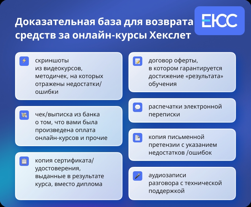 Вы имеете право оспорить решение Хекслет и добиться возврата денег через суд. Для сбора доказательств и подготовки документов вам понадобится помощь юриста. В этой ситуации наши специалисты помогут вернуть деньги.