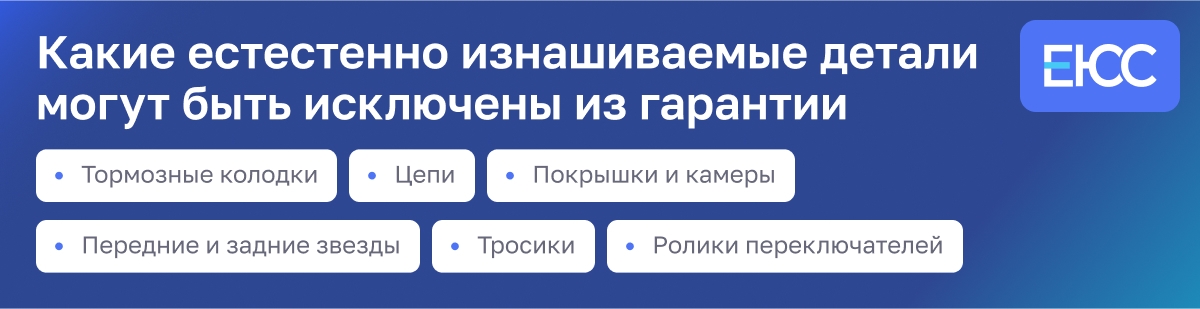 Гарантия, как правило, охватывает основные узлы: раму, вилку, втулки, рулевую колонку, трансмиссию. Однако производитель вправе исключить из гарантийных обязательств естественно изнашиваемые детали.