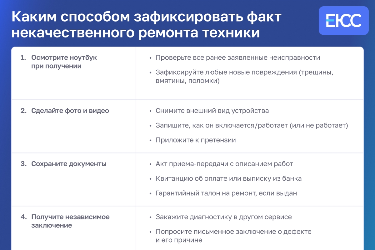 Таким образом, закон находится на вашей стороне, если ремонт ноутбука был выполнен некачественно. Но помните, что необходимо грамотно подготовить претензию, собрать доказательства и при необходимости обращаться за помощью к специалистам, чтобы успешно вернуть деньги за ремонт ноутбука в 2025 году.