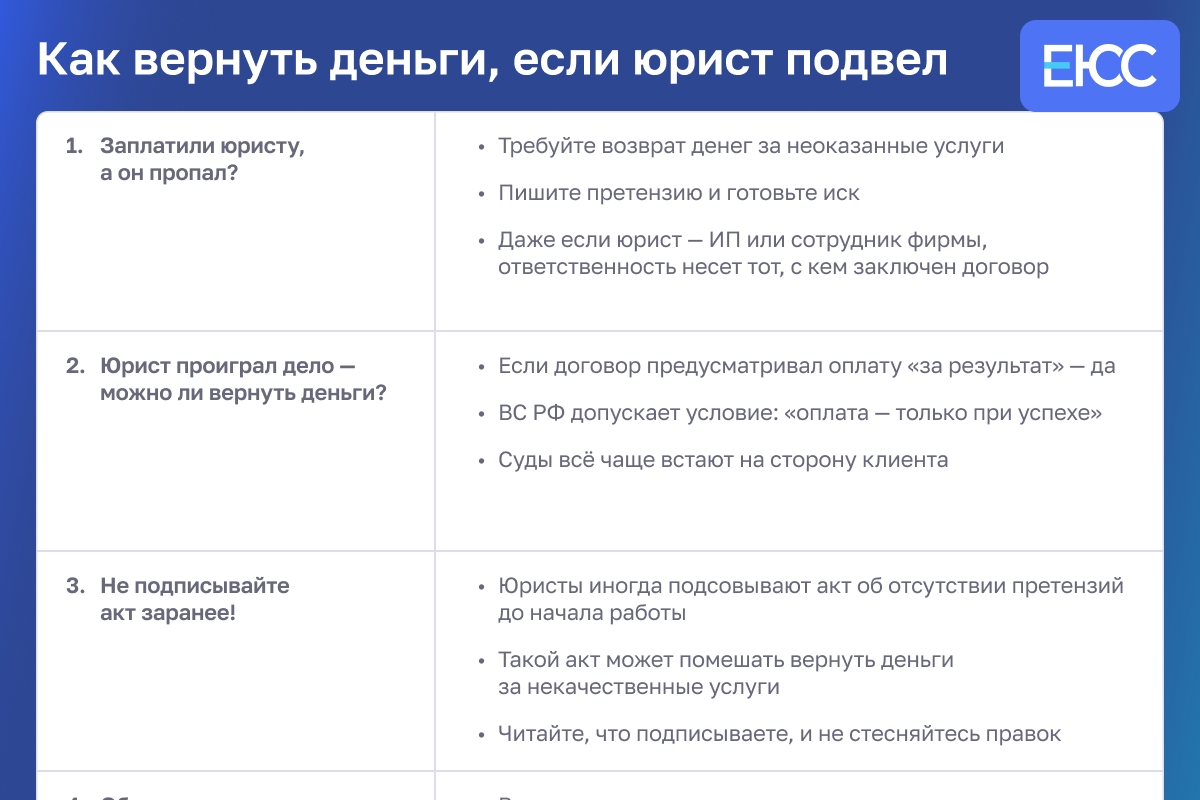 - И самое главное: если договором предусмотрено, что оплата зависит от результата, и результат не достигнут — клиент вправе потребовать возврат средств.