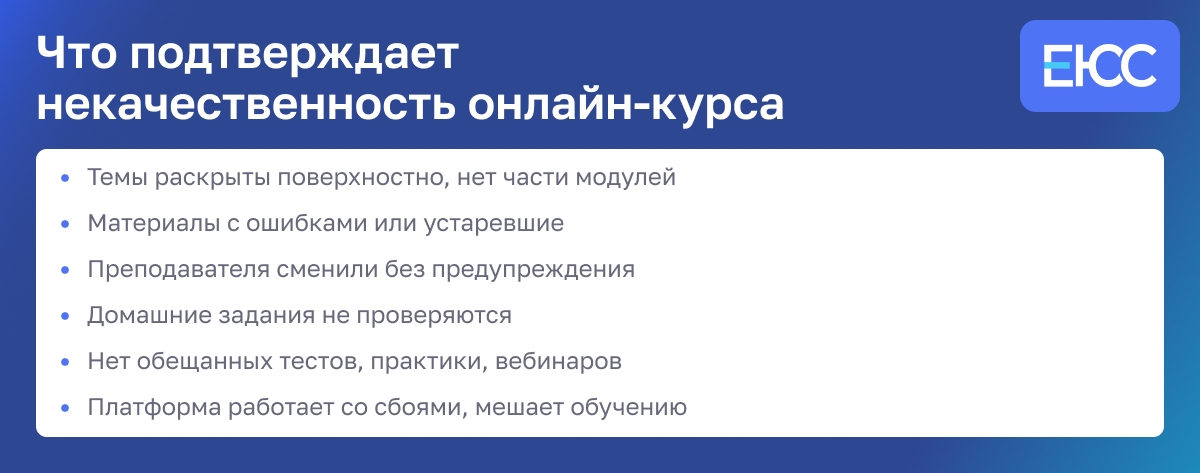 Даже если обучение пройдено, вы можете требовать деньги назад, если курс был не таким, как обещали. Например, не было кураторов, обещанной помощи или доступа к заявленным материалам. Это нарушение условий, и суд может встать на вашу сторону.